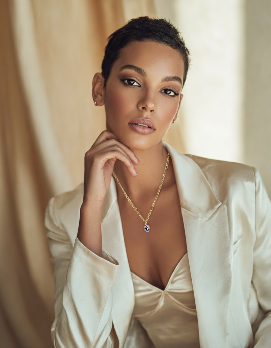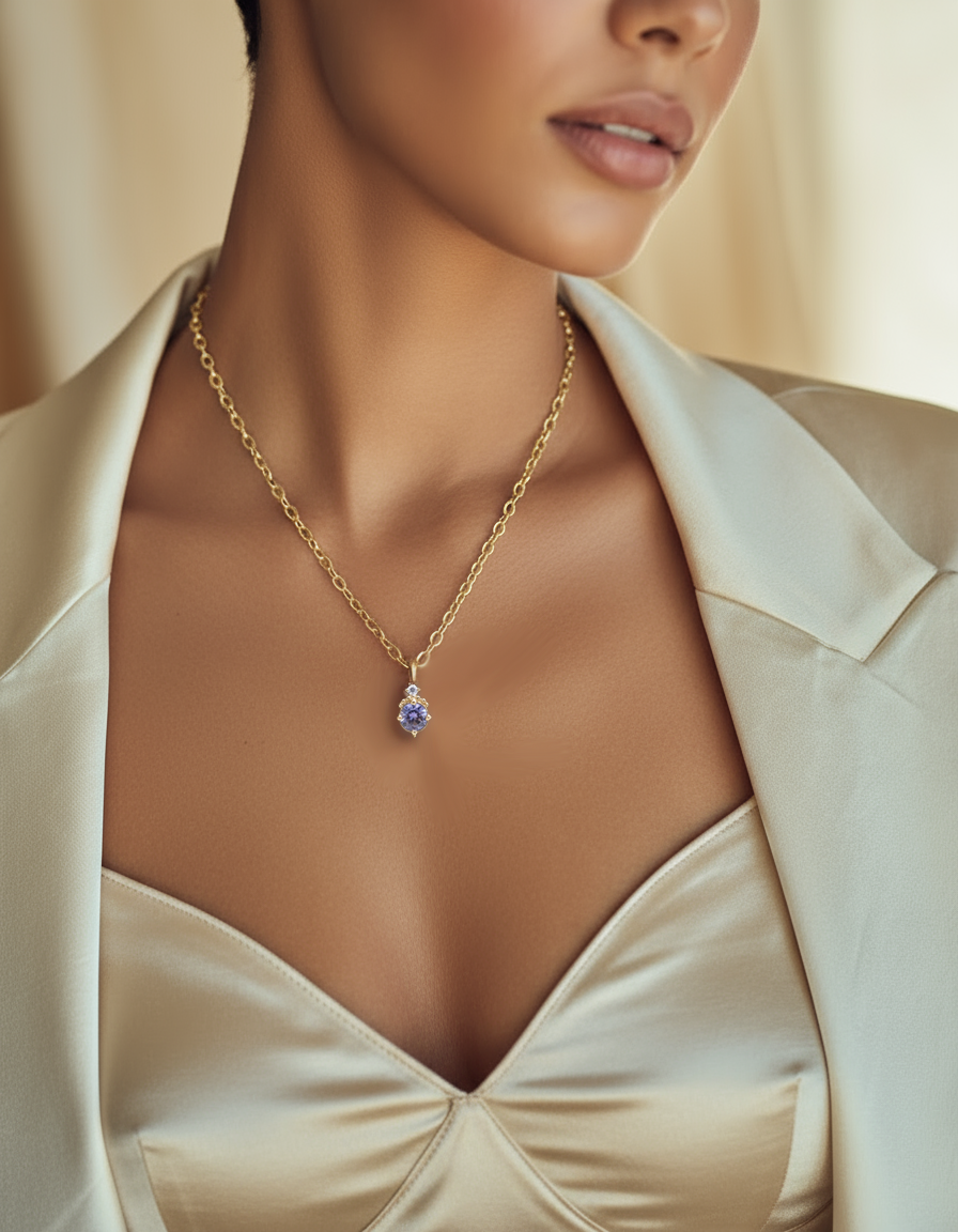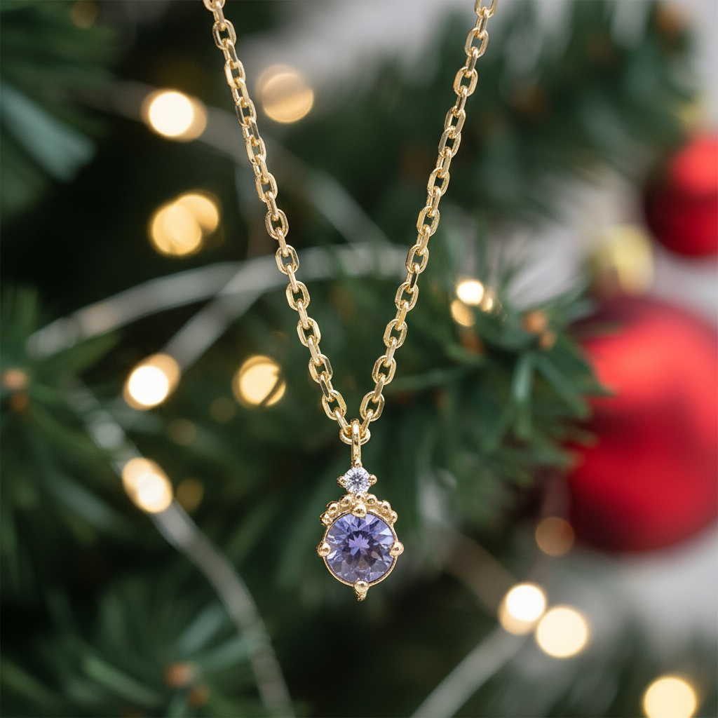 At its heart rests a violet-blue Tanzanite, shifting between hues like the twilight sky, crowned by a delicate crystal that glimmers as a winter star. Set in a golden chain, this design blends festive charm with timeless elegance — the perfect gift, or a keepsake of your own inner light. • Genuine Tanzanite gemstone with violet-blue brilliance • December birthstone — symbol of intuition & transformation • Gold-plated chain for refined festive glow • Crystal accent reminiscent of starlight • Lightweight and versatile for both daily wear and holiday styling