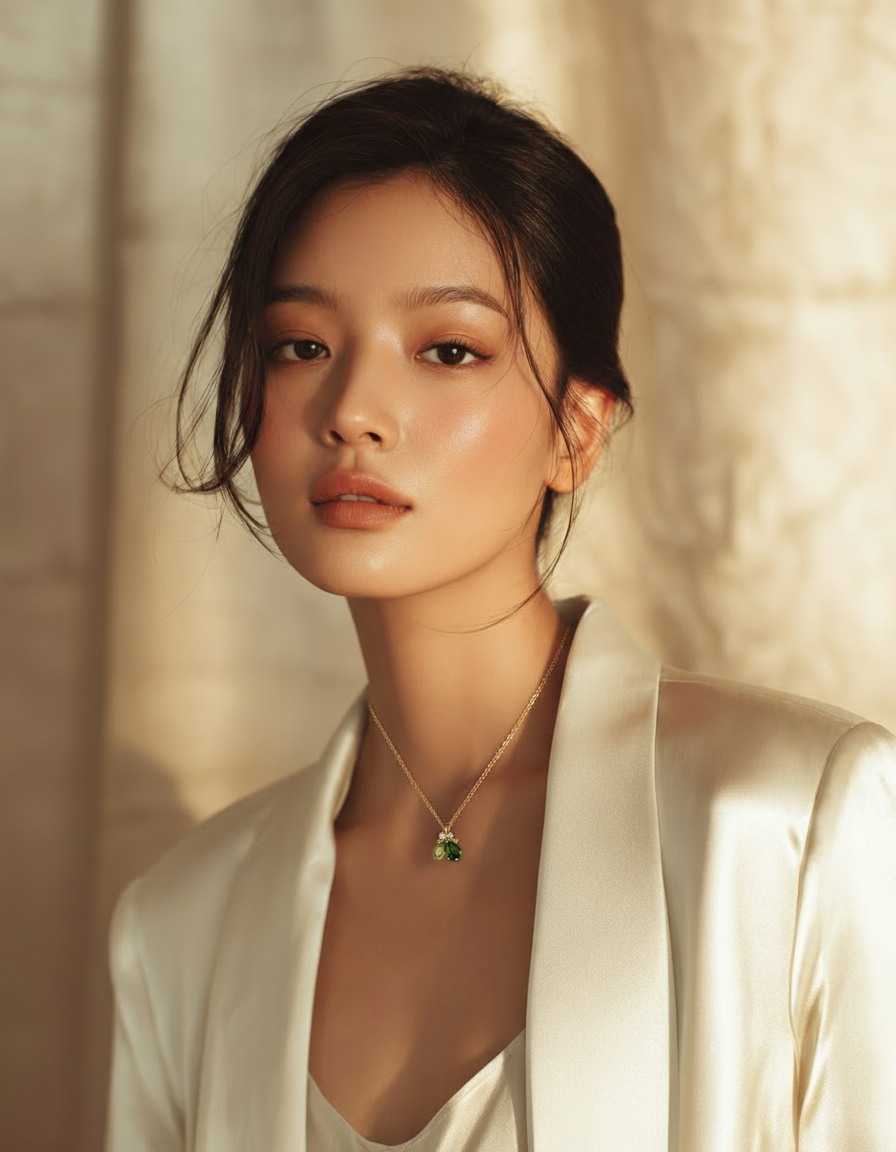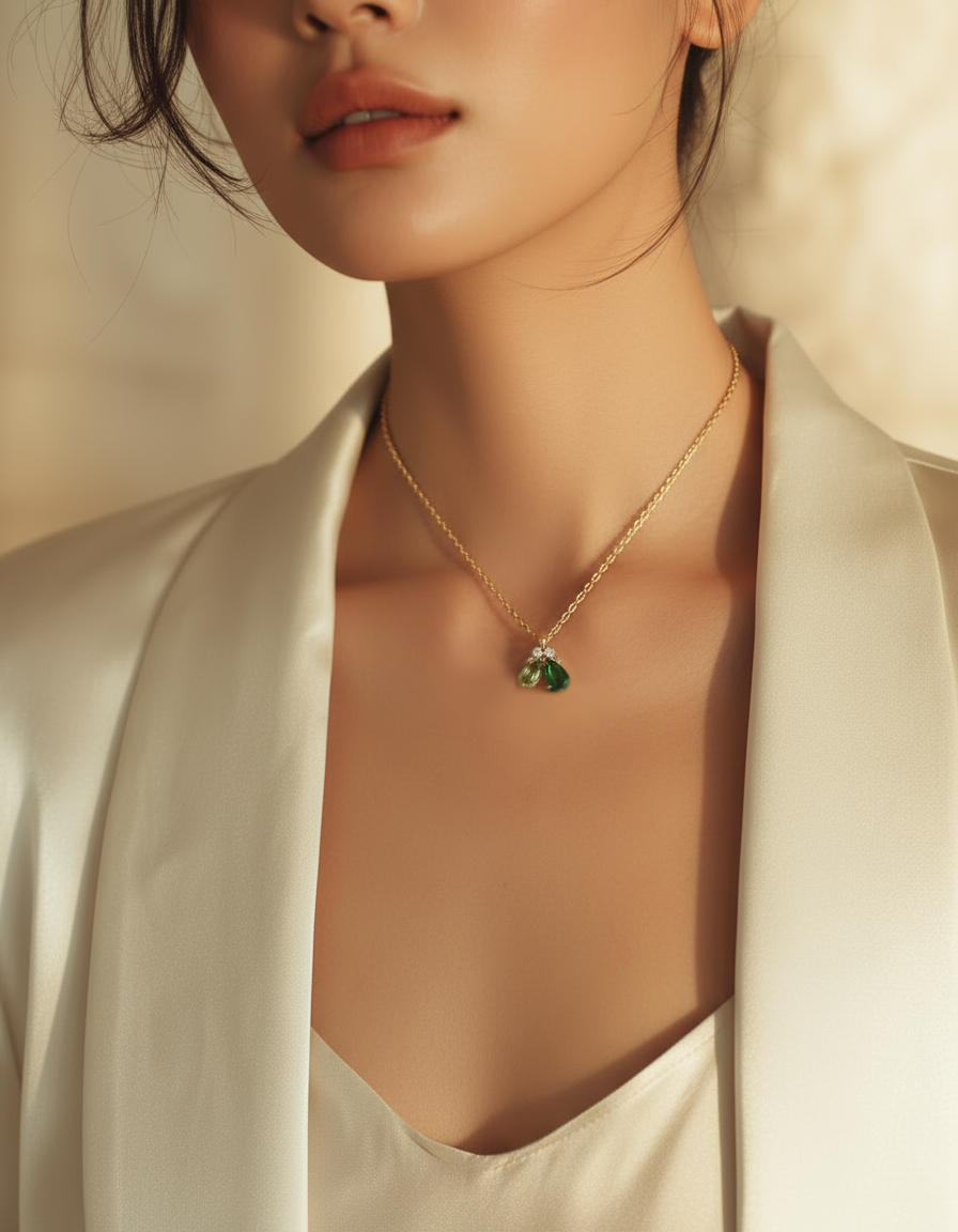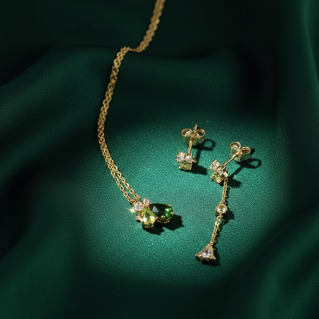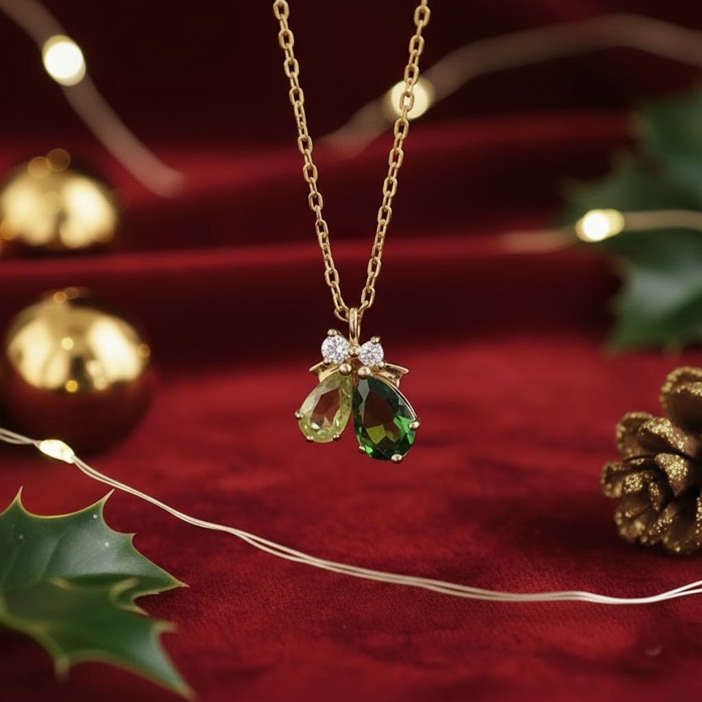 Set in a golden chain, this design blends festive warmth with timeless elegance — a perfect gift for your loved ones, or a luminous charm to treasure yourself. • Dual olive-green gemstones symbolizing renewal & harmony • Gold-plated chain for refined festive glow • Crystal accents reminiscent of starlight • Lightweight, elegant, and perfect for holiday styling.